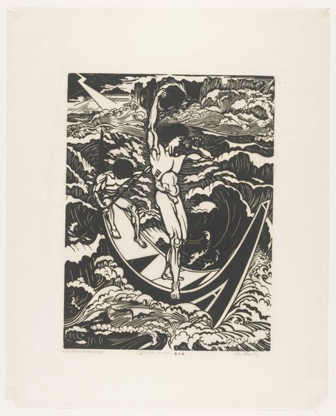Editor: This is "Title-page decoration" by Robert John Gibbings, currently housed at the Harvard Art Museums. It's a striking image, almost like a woodcut, featuring a whale breaching the surface. What jumps out at you when you look at this, Professor? Curator: Well, it makes me think about stories, about voyages and perils. The whale seems almost playful, but there’s a looming darkness in the sky and in the sharp, angular waves. Do you see how the artist uses black and white to create such a dramatic contrast? It’s as if the whole scene is a metaphor for life itself—beauty and danger intertwined. Editor: So, it's more than just a picture of a whale? Curator: Absolutely. Gibbings invites us to consider the delicate balance between humanity and the natural world. It's a small image, yet it speaks volumes, don't you think? Editor: Definitely something to ponder. Thanks for shedding light on that!