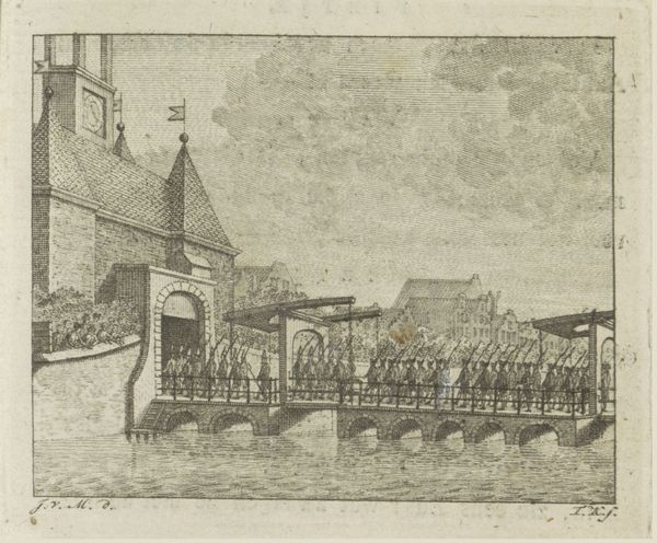 Curator: This is "Franse leger trekt Amsterdam binnen, 1795," or "French army enters Amsterdam, 1795", an engraving from between 1795 and 1796 by Theodoor Koning. The Rijksmuseum holds this print. Editor: It's such a detailed depiction of what looks like a pivotal historical moment. I notice how the French soldiers, on horseback, seem almost staged against the backdrop of Amsterdam’s architecture. What layers are at play here, beyond just a record of an event? Curator: It’s vital to consider this image as more than just documentation. How do you read the body language of the Amsterdam citizens as compared to the rigidity of the occupying army? Editor: There’s a sense of muted resignation, I think. A few people seem to be waving, perhaps in welcome, while others appear to be simply observing. It makes me wonder about their hopes and fears at this moment of regime change. Curator: Exactly! It pushes us to explore how such a depiction participates in, or even shapes, the narrative around occupation and power dynamics. Think about the gaze – who is the intended viewer? What kind of power dynamics does this impose? Editor: That’s a powerful point. Perhaps it’s a means of normalizing the occupation for a Dutch audience, subtly implying acceptance, while simultaneously showcasing French military might to deter resistance. The control over representation becomes a key instrument of dominance, doesn't it? Curator: Precisely. What seems like a straightforward historical image opens up when we examine its cultural function within a complex web of power relations, then and now. Editor: This really makes me reconsider the role of art in constructing and perpetuating historical narratives. Thanks for opening my eyes! Curator: My pleasure, thinking about these images in their full social contexts helps us connect them to our world today.
