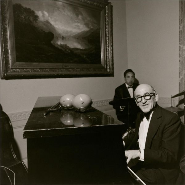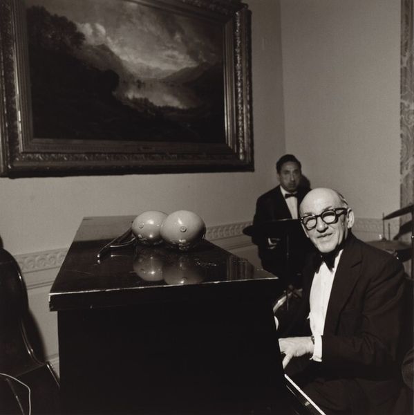 Editor: This photograph, titled "Jan Smeterlin achter een piano," was taken by Albert Petersen sometime between 1930 and 1940, made using a gelatin silver print process. I’m struck by the somber and contemplative mood of the portrait, amplified by the limited grayscale and shadows. How do you read this image? Curator: The most apparent symbol here is, of course, the piano, an object so laden with cultural meaning. More than mere entertainment, the piano became associated with refinement, class, and artistic expression, and domestic virtue. Why do you think Petersen chose this instrument as the main symbol surrounding Smeterlin? Editor: I suppose to signify Smeterlin's profession and talent? Perhaps to also present him as cultured? Curator: Precisely. And what about Smeterlin's gaze? It meets ours directly. This isn't a candid shot of an artist lost in his craft, but a carefully constructed image meant to convey a certain persona. Do you see the tension between the performative aspect, his presentation to the camera, and the inherent intimacy associated with musical creation, or with photography in general? Editor: Yes, I see that now. It feels like we’re being invited into a private world, yet we are also being kept at a distance by the formal nature of the portrait. It's interesting to consider the psychological impact of that deliberate staging. Curator: These symbols work together to cement Smeterlin’s presence within a historical and artistic context that transcends merely taking someone's photograph. Editor: I see now how the photograph can serve as both a personal record and a carefully crafted piece of iconography! It definitely gives a different weight to a seemingly straightforward image.