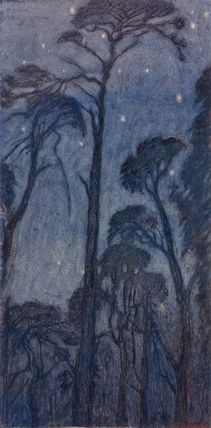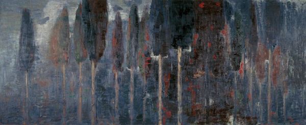 Editor: So, this is Roderic O'Conor's "Boulevard Raspail," painted in 1907 with oil on canvas. It feels quite dark and moody. The buildings look imposing and almost oppressive. What's your take on it? Curator: Oppressive, yes, like a stage set for some nocturnal drama! O'Conor's Boulevard Raspail breathes an atmosphere, a tangible presence rather than simply representing a Parisian street. It’s slathered in evocative shades of blue, burnt sienna, and umber. Can you almost feel the chill of the Parisian evening clinging to the buildings? Editor: Definitely. It's not the cheerful, bright Paris you see in Impressionist paintings. Why do you think he chose such a somber palette? Curator: Perhaps to evoke a more introspective, even alienated mood? Remember, O'Conor was a Post-Impressionist, flirting with Expressionism. It's not just about capturing light; it’s about conveying an emotional state. Look at those figures shrouded in shadow. Are they ghosts, observers, or simply people hurrying home? Editor: Ghosts, I like that! So it's more than just a cityscape; it's a state of mind? Curator: Precisely! He lets the colors sing the blues, creating a visceral, almost melancholy experience for the viewer. What does the paint texture itself suggest to you? Editor: That the brushstrokes are really visible, almost frantic, gives a sense of urgency or unease. Curator: Bang on! He used a broken brushstroke technique to convey that anxiety or sense of rapid change happening at the time. The world on the precipice, perhaps? Editor: It's funny how a street scene can reveal so much about feelings, hidden under the surface. Curator: Exactly. He captured the street, not as a postcard, but as a lived experience, a mood made visible. An urban lament, beautifully, broodingly rendered.