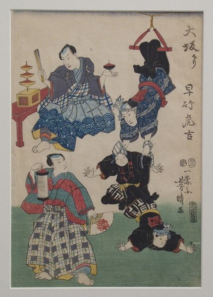 Editor: This is "Acrobats Beneath Cherry Trees: Spinning Tops and Balancing," a woodblock print by Utagawa Yoshiharu from 1857, currently at the Met. It strikes me as incredibly dynamic; the figures are positioned in such unexpected ways! What draws your eye in this piece? Curator: I see a powerful commentary on Edo society cleverly veiled beneath this vibrant scene. Look closely; the seemingly joyous performance is layered with social critique. Ukiyo-e, while celebrated for depicting the 'floating world' of pleasure, also functioned as a site for subtle resistance against rigid societal norms. Editor: Resistance? I hadn't considered that. What makes you say that? Curator: The acrobats themselves. Consider their position outside the established order. These performers, belonging to a lower social class, momentarily occupy the viewer's attention, even dominance. Notice how the print equalizes, or even inverts, hierarchical relationships by placing them "above" the cherry blossoms, a traditional symbol of the ruling samurai class. What's the significance of play within rigid societal hierarchies? Editor: I guess the playfulness could be a way to critique social structures. They are literally subverting expectations with their acrobatic movements! And I see how the artist uses their elevated position to give them agency. Curator: Precisely. Yoshiharu is subtly advocating for those often marginalized. This isn’t just about entertainment; it’s about who has the stage and what message they're conveying through their bodies. The choice of medium, the widely distributed woodblock print, amplifies the message by ensuring it reaches a wider audience across class lines. Editor: That makes me think about who *didn’t* have a voice in Edo society and how even simple art could give it to them. Thank you; I'll never look at Ukiyo-e the same way! Curator: It’s crucial to remember that even beauty can be a battleground for social justice. I'm so glad that, hopefully, the audience now can have a greater understanding.