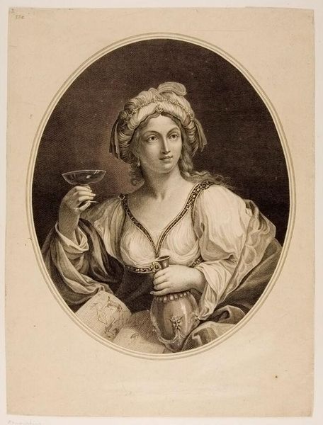 Editor: This is William Sharp's "Circe," a print from the late 18th century. The oval composition and classical subject matter give it a very formal feel. How do you interpret this work in the context of its time? Curator: Sharp’s "Circe" speaks volumes about the era’s fascination with classical narratives and the representation of powerful women. Circe, the enchantress, wasn’t just a figure from Homer; she was a symbol of female agency, though often portrayed through a patriarchal lens. What does her poised presentation suggest about prevailing attitudes toward female power and knowledge? Editor: That's fascinating! It makes me wonder if there was an active feminist dialogue when Sharp made this. Curator: Indeed. Consider how Sharp negotiates depicting a potentially subversive figure within the artistic conventions of his time. The details open up complex dialogues about gender, power, and representation. Editor: I hadn’t considered that balance before. Thanks, this was a great way to interpret the image.