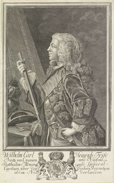Editor: This is Johann Georg Wille’s portrait of Charles Louis August Fouquet, Duke of Belle-Isle. The detail is incredible! There’s so much going on, from the battle scene in the background to the Duke's armor. What do you see in this piece? Curator: Notice how the artist positions the Duke—not just as an individual, but as a symbol of power and prestige? The armor evokes strength, but the flowing wig and delicate lace point to a courtly refinement. The battle isn't merely a backdrop. What narrative threads do you think Wille is weaving? Editor: Perhaps it's about showing both the strength and sophistication of the aristocracy at the time? It is certainly interesting to see how the portrait blends the two. Curator: Exactly. It's about legacy, lineage, and the cultural memory of power represented through the image. These symbols, these visual cues, tell a story far beyond the Duke himself. Editor: I never thought of it that way before. Thanks!