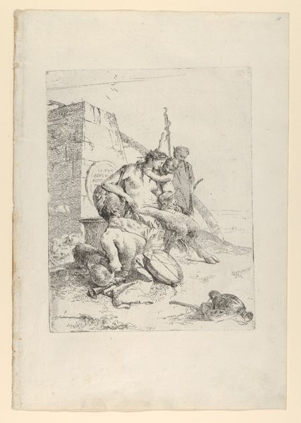 Editor: So, this is Rembrandt van Rijn’s “The Stoning of St. Stephen,” created in 1635. It’s an etching, a pretty small print. It feels… intensely chaotic. All those figures crammed together, the violence about to happen. What jumps out at you? Curator: The light, naturally. Rembrandt orchestrates shadow and illumination not just to depict the event, but to amplify its psychological weight. See how Stephen is bathed in light, a visual signal of grace even as darkness closes in. And what do you make of those observing figures in the shadows? Editor: They seem… almost detached? Like spectators at a gruesome game, or they represent moral apathy. Are you saying they symbolize something deeper about societal complicity? Curator: Precisely! Rembrandt frequently employed historical or biblical narratives to reflect on contemporary issues. Consider the composition itself. The compressed space, the swirling lines... it generates a sense of claustrophobia. What does this tight grouping signify for you in the narrative? Editor: It emphasizes the mob mentality. The individual faces are lost in the mass, driven by collective violence. It's almost primal. You know, the scene almost reads like a stage with dramatic spotlights and shadowed corners, everything is there to deliver a clear message, right? Curator: It's not just a message but an invitation for introspection. Why do we participate or stay silent in the face of injustice? The symbolic resonance persists. Editor: It’s amazing how much meaning is packed into such a small image! I didn’t think about the observers representing societal silence; it adds a completely new layer. Curator: Indeed, Rembrandt's prints invite such continuous unveiling, layered meanings through visual language.
