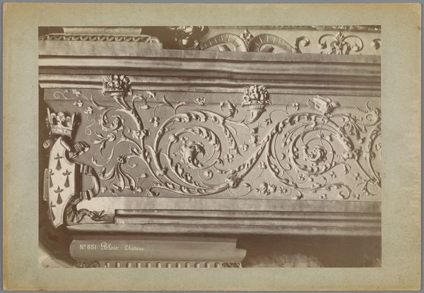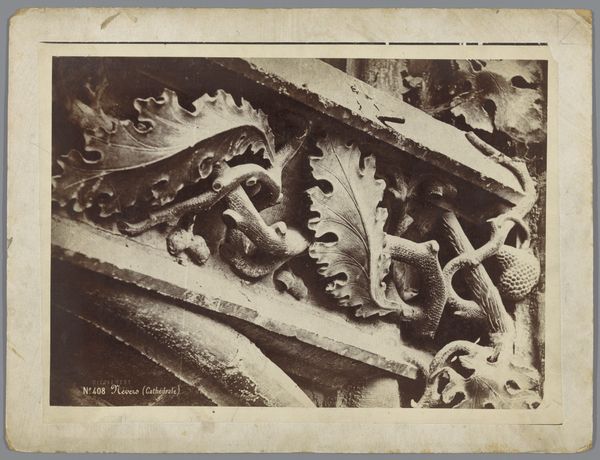 Curator: We’re looking at a photographic print titled "Deel van de tombe van Alfonso Altoviti in de Santi Apostoli te Florence," believed to have been created between 1875 and 1900 by Edizione Brogi. It depicts, as the title suggests, part of the tomb. Editor: Immediately striking is the almost visceral contrast: death rendered in stark white marble, beautifully crafted, but undeniably a chilling tableau of skull and serpent. Curator: Indeed, the tomb utilizes potent memento mori symbolism. Note how the snake, often representing cyclical time and knowledge, entwines the skull, a stark reminder of mortality. The winged figure as well presents a classic allegorical image of passing. It's fascinating how the baroque influence manifests in the dynamism, despite the static nature of the medium now displayed through this photograph. Editor: Absolutely. The labor involved in the original marble carving must have been immense. Think of the quarrying, the transportation, the skill required to achieve such detail. And here, we have it mediated through a photographic print, democratizing access but also distancing us from the physical making. What's intriguing is that through the photograph it abstracts the context from a particular place to create this copy removed from labor. Curator: That act of translation impacts how we perceive the work. Photography allows the creation of infinitely reproducible images, transforming it into a mass-produced cultural artifact. The original sculpture would've been rooted in a very specific location. This photographic reproduction transcends spatial limitations and emphasizes a generalized awareness about death. The allegorical aspect of such representation gives the piece power over long periods of time. Editor: It's almost an industrialization of mourning. Turning these deeply personal expressions of loss into repeatable commodities through different channels. The photograph in itself functions materially for that. It is striking though how baroque ornamentation transforms death into a statement, literally materialized. Curator: Considering this image through the lens of symbolic representation enriches our appreciation of artistic and cultural memory. Editor: Agreed. Reflecting on the interplay of original artistic craftsmanship and the reproduction inherent in photography highlights questions about value and access that still resonate today.