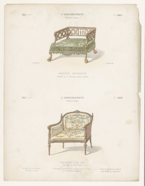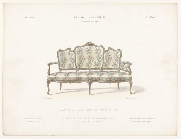Curator: Here we have a print titled "Canapé" dating roughly between 1895 and 1935. Editor: It’s delicate, isn’t it? A restrained use of color… It almost feels like a technical drawing rather than something purely decorative. Curator: It certainly bridges a gap. It's printed on paper and incorporates drawing techniques. Given the title mentions “Louis XV,” we’re likely looking at a historical record or an interpretation of a settee from that era, reproduced for a later audience. The very existence of 'Le Garde-Meuble' suggests an intent to document furniture designs and possibly offer them for reproduction. Editor: Exactly. Think of the labor involved – the artisanal skill in rendering such fine details for print reproduction. It speaks to a particular form of consumption. Someone, somewhere, would see this and aspire to have it replicated or perhaps commission something similar. This image is part of the chain of production. Curator: Precisely. And the publication details further contextualize its role in the design marketplace of the late 19th and early 20th centuries. These details offer valuable insights into the broader historical context. This was not just art, it was business. Editor: A business intertwined with cultural aspirations. That floral design is certainly not accidental; even then, the fabric and woodwork spoke to a social class and the culture it wanted to reflect, literally furnishing their space, and, more broadly, their image. Curator: An image carefully cultivated and meticulously reproduced. This piece is not only an aesthetic object, it embodies economic and social relationships of its time. Editor: A blueprint for both a canapé and a certain echelon of society. Curator: Quite. This work reminds us of the art and the object in service of cultural power. Editor: And it subtly unveils the production of desires and class aspiration, made through the very work of the draughtsman's labor.