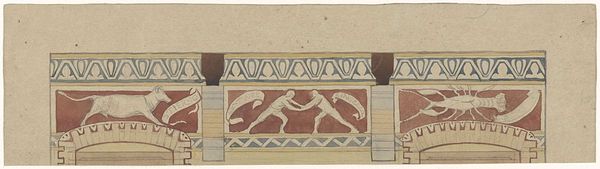 Curator: Welcome. We’re looking at Antoon Derkinderen's "Waterman, Vissen en Ram," created sometime between 1869 and 1925. It appears to be a mixed-media drawing, employing watercolor to achieve its effect. Editor: The colors are surprisingly muted, aren’t they? It evokes a feeling of ancient frescoes, something unearthed from a villa in Pompeii. But I can't quite place it… is it decorative? Or functional in design? Curator: Functionality may be its primary concern. Observe the triptych structure: three distinct panels, separated by architectural, pillar-like divisions. The art nouveau stylized zodiac signs on the salmon backdrop—aquarius, pisces, aries—could be part of a frieze for interior decoration. Editor: A home perhaps? The zodiac signs lend a certain domesticity. I can also envision it as the preliminary artwork for some monumental, public work... something about the symmetry gives it such grandeur. The symbols, so clearly of their time, intersect surprisingly with images derived from earlier ones: water bearers feel ancient while also being thoroughly Art Nouveau in rendering. Curator: Indeed. There is a beautiful tension at play. I am also struck by how the mixed-media contributes to a flattened plane. This visual effect is augmented by the fact that this horizon doesn't rely on perspectival depth to convey three-dimensional space; its depth comes entirely from color and design relations within a composition where color is used symbolically. Editor: And with the zodiac symbols in mind, let us also not overlook how often astrology, both as a symbolic language but also as a science, was practiced among women, particularly domestic women who may have relied on the home as both a respite, but also a location from which their work and ideas are born. How would this potential reading of its intended audience or context color your own read of this work? Curator: The beauty of its symbolic simplicity and decorative purpose becomes enriched by the potential sociopolitical realities surrounding its origin. Editor: And perhaps a glimpse into futures not yet known. A domestic aesthetic that points to larger existential ideas.
