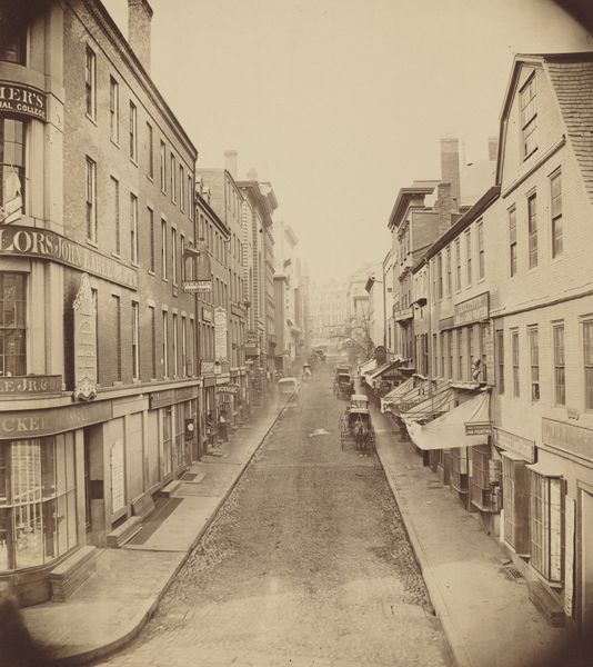 Curator: Here we have "Gezicht op de Breestraat te Leiden," a photograph attributed to Jan Goedeljee, placing its creation somewhere between 1850 and 1900. Editor: It's amazing, really, how this snapshot captures a sense of bustling ordinariness, even through the sepia tones and the slightly grainy texture. It looks like the city hasn’t changed much! Curator: Indeed, and while its aesthetic leans towards realism, it's also important to view such street scenes as documents of urban development. Goedeljee’s Leiden reflects an era grappling with industrial progress, visible through the blend of horse-drawn carriages and hints of commerce embedded in its architecture. Editor: I’m particularly struck by the depth of perspective, it really focuses your eye. It begs the question, who occupied those buildings? Were there systems of power and class at play, and how were the working classes implicated within urban dynamics? I can imagine them working there. Curator: Absolutely. Photography in the 19th century began to democratize portraiture, offering access beyond the elite. However, its role within imperialistic practices, constructing otherness, cannot be ignored. Do these portrayals further marginalization or foster understanding? The image feels quiet, but there's a whole system moving here. Editor: It's about holding space for those critical dialogues. A cityscape might seem neutral, but photography inherently makes a statement, a record, even a commentary on society. Look at that busyness, there were already hierarchies shaping urban experience. I’m glad the author preserved it. Curator: Well said. It reminds us to engage with these images not just aesthetically but also ethically, considering their roles in shaping public memory. Editor: Absolutely, it urges us to keep pushing these narratives further. There’s always space to do better when it comes to who’s shaping the historical account and whose vision truly guides the narrative.