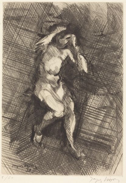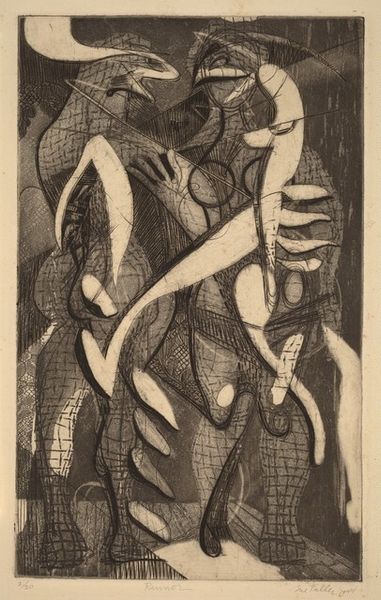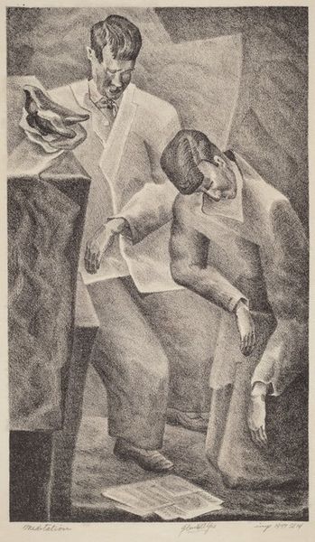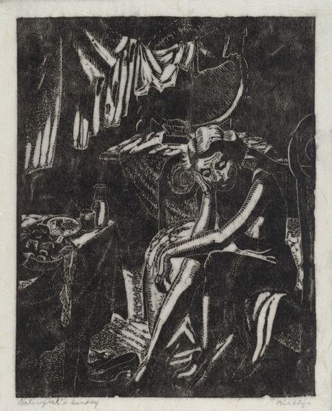 Shelby Shackelford created this woodcut print called "Girls Bathing" in 1932. The image is dominated by the contrast between light and shadow, achieved through bold cuts into the woodblock. Notice how this stark contrast accentuates the figures' forms and imbues the scene with a sense of drama. Shackelford uses expressive lines to define the contours of the figures and the geometric shapes in the background. The composition is structured around the dynamic poses of the women, one solid and present, and the other a more ghostly representation of a figure in motion. The artist’s interest lies in portraying bodies which are robust and sensuous. This work destabilizes traditional notions of beauty and form by emphasizing volume and physicality. The figures occupy a flattened space, challenging conventional perspective. The print’s graphic style and emphasis on strong lines echo the broader artistic concerns of modernism. It invites us to reconsider fixed meanings of the female form and engage with alternative modes of representation.