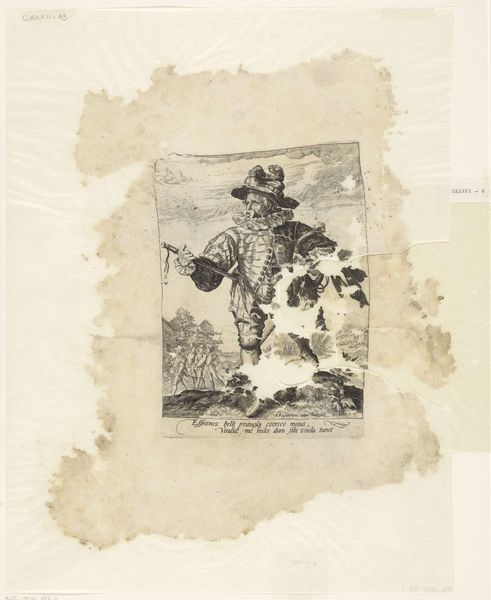 Editor: Here we have an engraving titled "Kolonel" made anonymously sometime between 1587 and 1596. It’s currently held at the Rijksmuseum. It depicts a man, seemingly a soldier, in an unusual landscape, pieced together in a somewhat disjointed fashion. What's your interpretation of this somewhat fragmented image? Curator: The fragmentation, I think, is crucial. Consider the period. The late 16th century saw massive social upheaval, religious wars, and the rise of colonial ambitions. Doesn't this "Kolonel," pieced together from different contexts, reflect the fracturing of identity and the disrupted landscapes caused by conflict and expansion? Is he a complete figure, or a composite, a representation of the fragmented experience of war? Editor: That's interesting. I was initially focused on the odd composition, but now I'm considering the figure as a symbol of that era's turbulence. Do you think the artist was intentionally commenting on the morality of these colonial figures? Curator: Absolutely. The inscription, though faded, invites scrutiny. And think about the power dynamics at play. Here is an anonymous artist depicting a figure of authority – the "Kolonel" – but doing so in a way that questions his very coherence, his place in the world. Where does his power truly come from? And what are the consequences of such power? The artist subtly undermines the Colonel’s authority, prompting us to question the ethics of colonialism and military dominance. Editor: So, the visual disruption and historical context come together to create a really critical statement about power and its effects. Curator: Precisely. This isn't just a portrait; it's a visual commentary on the complexities and contradictions of a turbulent era and of colonial violence. Editor: I never would have gotten that depth from just looking at it. It is amazing how history impacts the artist's interpretation. Thank you for that eye-opening reading! Curator: My pleasure. Thinking about art through these intersectional lenses allows us to engage more critically with both the past and the present.