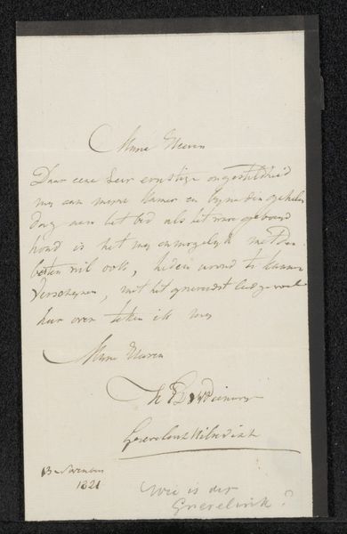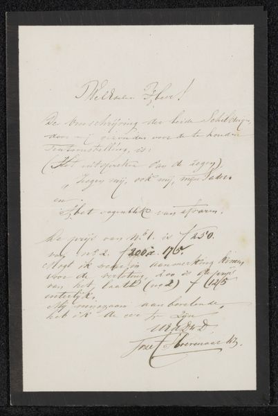 Curator: Looking at "Annotatie" by Johannes Bosboom, dating from 1827 to 1891, which we currently have here at the Rijksmuseum, what’s your immediate reaction? Editor: It feels so intimate. It's the kind of thing you imagine finding tucked away in a dusty archive, all delicate, aged paper and faded ink. I'm curious about the texture, I imagine the paper must be thin. Curator: The visual weight here comes from historical context as much as from the literal inscriptions on the page. Note how the formal script points to established systems, yet this annotation acts as a kind of personalized reading, capturing ephemeral thought. Editor: It's interesting that you mention 'established systems,' because I'm more struck by the physical process. Someone selected this paper, mixed ink, and applied both to surface. We know the results weren't designed to last—look at how the watercolor bleeds! Curator: That bleed interests me precisely because it signifies loss over time—that watercolor bleed operates like tears, visually signifying the work’s inevitable aging and marking its symbolic value. Editor: The address listed at the top also speaks volumes, particularly given Bosboom’s history and the timeframe. I wonder what was across the street at number 69 on the Champs-Élysées? I suspect this wasn't happenstance! Curator: We see a name scrawled at the bottom in the artist’s own hand. That signature anchors the composition with its distinct curve and boldness. What could that stylized symbol convey? Editor: Indeed, seeing his mark upon this thing that has itself already been so worked… that signature, to me, stands as an intervention itself in processes and a subtle claiming of labour within material decay. Curator: So, it really is a portal, a peek into the life and workings of an artist from the 19th century. I appreciate your highlighting its intimate textures. Editor: Yes, this wasn't high art intended for display, and seeing all the material decisions really changes our reading of history here. It’s refreshing.