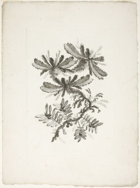 Curator: Welcome. We’re standing before "Bouquet, from Collection of New Flowers of Taste for the Manufacture of Persian Cloth, Invented and Drawn by Jean Pillement." This etching, dating from 1765 to 1770, reveals much about 18th-century aesthetics and the globalization of design. Editor: Well, it's striking! It has a strangely ethereal quality. Stark contrasts of dark grey and the pale paper create something otherworldly, even though it depicts familiar plants. A world pressed between the pages of an herbalist’s diary. Curator: Precisely. Pillement was not simply rendering botanical specimens. As the title indicates, this print served as inspiration for textile designs, particularly Persian cloths popular in Europe. Its creation highlights how artistic innovation was directly linked to manufacturing needs and intercultural exchange. Editor: Textiles! Yes, I see that now, that explains the carefully patterned repetition within each stem and leaf; almost like musical notations on a natural staff. It really is like looking at a design blueprint—functional and beautiful simultaneously. How ingenious is that? Curator: Pillement’s strategic dissemination of such prints demonstrates how artists sought new markets beyond traditional painting or sculpture. They engaged directly with artisans, expanding art’s role in everyday life. Furthermore, botanical illustration reflected growing Enlightenment interests in classifying the natural world. Editor: That speaks volumes about access, too, doesn't it? The fact that artisans and the manufacturing sector have a shared visual language… So many implications about status and who has control of artistry itself. And you're right – you could practically read it like a guide for budding botanists! Curator: Exactly! These types of design and knowledge circulated quite broadly. "Bouquet" stands as a fascinating intersection of art, craft, science, and commerce during the Enlightenment era. Editor: It definitely expands the notion of what art can be, and how profoundly influential these seemingly "minor" art forms can be on culture, then and now. Thanks to this print, a clothmaker in France might touch the aesthetic realm of Persia! Curator: A fine point, and I concur that it opens exciting vistas onto the cultural landscape. Editor: Likewise, it's always enlightening to discuss a piece and appreciate how it reveals a fascinating sliver of history!