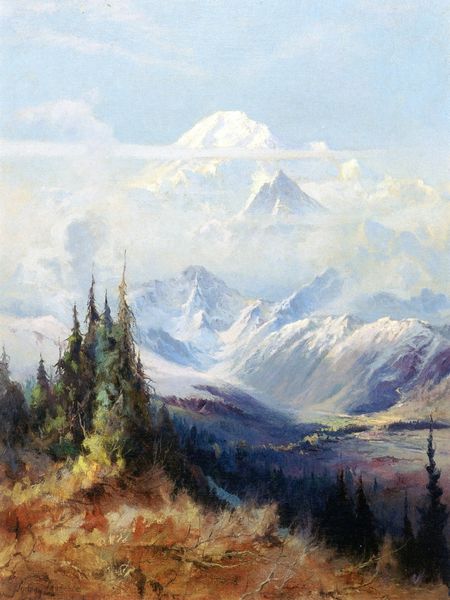 Editor: This is Albert Bierstadt's "Landscape with Snow Capped Mountains." Though undated, it's done in oil paint. There's something awe-inspiring but also a bit forbidding about this landscape. What strikes you when you look at it? Curator: The compositional structure is quite remarkable. The immediate foreground pulls us in with that softly lit path, but our gaze is almost immediately propelled upward by the verticality of the evergreens. This ascent culminates in the dramatic snow-capped peaks that dominate the horizon line. Do you perceive how the dark, densely textured forest contrasts with the smooth, almost ethereal quality of the mountain range? Editor: Yes, I see how that contrast emphasizes the distance and height of the mountains. Almost like the trees are reaching for them. Curator: Precisely. Now, observe how the artist manipulates light. The diffused light creates a sense of atmospheric perspective, further enhancing the depth of the scene. Light isn't used to merely illuminate but to sculpt the visual space. The variations of colour between light and shadow areas have this desired affect. What do you make of this construction? Editor: It really makes you feel like you're standing there, at the edge of the woods, looking up at something immense and timeless. The layering gives that perspective and scale, like Russian dolls, and makes the world feel immense. Curator: An interesting analogy. Essentially, Bierstadt invites us into a visual experience that prioritizes the emotional impact of scale and sublimity through deliberate structuring of form and light. Editor: That’s a much clearer understanding than when I started. It's fascinating to consider how carefully constructed these seemingly natural scenes were. Curator: Indeed. Focusing on such structural techniques enhances our perception, and the impact art has on ourselves.