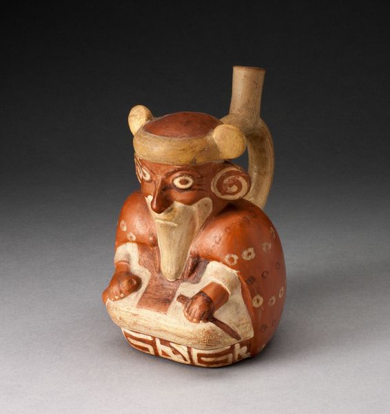 This is a ceramic handle-spout vessel in the form of a seated man, created by the Moche people of ancient Peru. Such vessels are a distinctive feature of Moche culture, and they offer unique insights into their society. The figure's elaborate tattoos or painted face markings likely denote social status or affiliation. The act of depicting this man in such detail suggests a culture where personal identity and social roles were carefully defined. The vessel itself might have been used in rituals or as offerings, reflecting the integral connection between art, religion, and daily life in Moche society. Archaeological research, along with studies of Moche iconography, can reveal more about the specific social and institutional context in which this vessel was created and used. The meaning of art is never fixed; it evolves as we learn more about the people and cultures that produced it.