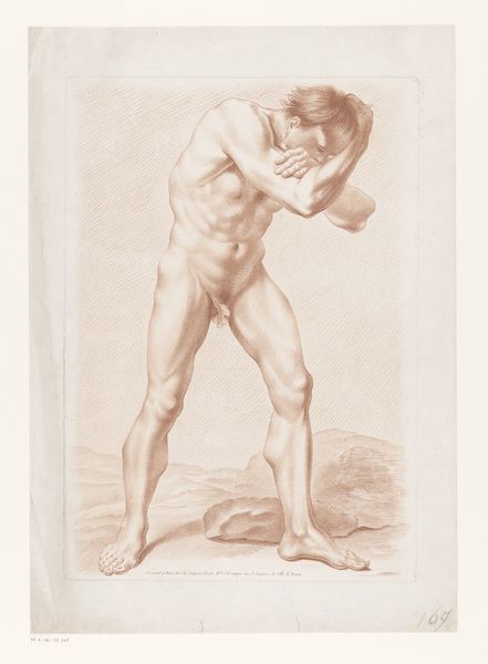 This red chalk drawing of a nude man running to the right was created by Domenico Cresti. The figure's pose, with arms outstretched and one leg forward, speaks to a lineage of movement studies in Renaissance art. Consider, for instance, the striding figures on ancient Greek pottery, or even the dynamic poses within classical friezes. This motif of forward motion appears throughout art history, often symbolizing progress, escape, or the relentless passage of time. The raw emotion captured in his straining muscles connects to our deepest instincts and fears. Think of similar figures in Géricault's "Raft of the Medusa," where bodies contort in agony and desperation. This act of running transcends mere locomotion; it embodies a primal urge to survive, to overcome, and to push beyond limitations. Ultimately, the image echoes across centuries, transforming and adapting to each new context while retaining its core emotional power.