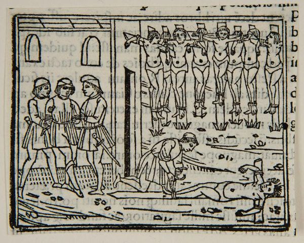 Curator: The image before us, titled "Book IX.5. Roman consuls are sent under the yoke of Samnites and are exposed to disgrace," presents a stark depiction of defeat. Editor: It's immediately striking how the harsh lines and contrasting tones amplify the humiliation inherent in the scene. Curator: Indeed. The central motif of figures beneath the yoke signifies subjugation, a potent symbol found across cultures to represent shame and the loss of power. Notice the arrangement of the figures: those forced beneath the yoke are stripped bare, a symbolic shedding of their status. Editor: And the repetition of spears and shields creates a rigid, almost suffocating frame around the central figures, visually emphasizing their captivity and the permanence of the Samnites' victory. Curator: Consider, too, how the shields are emblazoned with symbols of the Roman state, now rendered powerless, discarded in defeat—helmets cast aside at the bottom edge. The image serves as a stark warning about the consequences of hubris and military failure. Editor: The artist, though anonymous, has masterfully used formal elements to underscore the narrative's emotional and symbolic weight. A simple yet powerful lesson in visual storytelling. Curator: Precisely, a reminder that images, even in their simplest forms, can carry the heavy burden of cultural memory.
