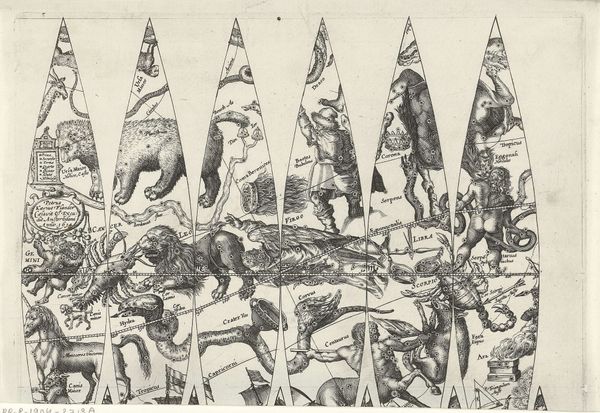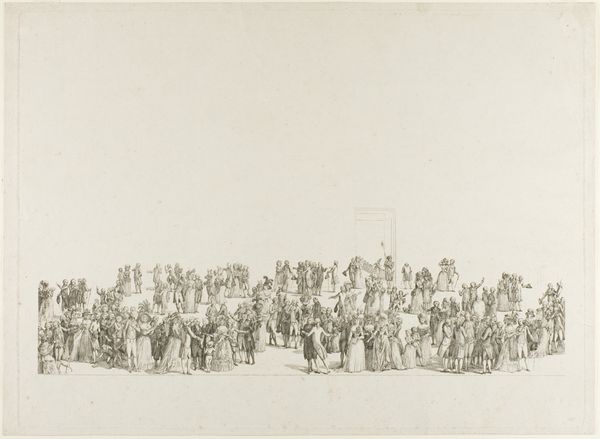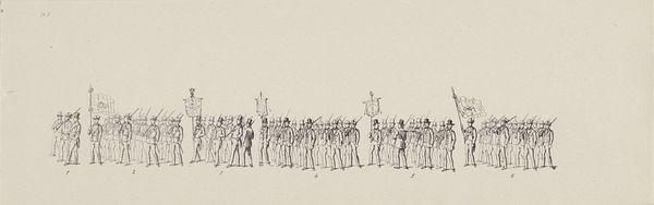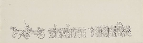 This lithograph depicts a historical costumed parade in Amsterdam celebrating the 25th anniversary of King Willem III's reign in 1874. Although the artist remains anonymous, this print offers insight into the processes of mass media and social life in the late 19th century. Lithography, the printmaking process used here, relies on the chemical repulsion of oil and water. An image is drawn on a stone or metal plate with a greasy substance, and then printed using ink that adheres to the drawing but not the wet areas. The material qualities of lithography allow for detailed line work, evident in the rendering of the paraders' costumes and banners. This print reflects the rise of mass media and print culture, making such celebrations accessible to a wider public, and shows how images like this helped construct a shared national identity.