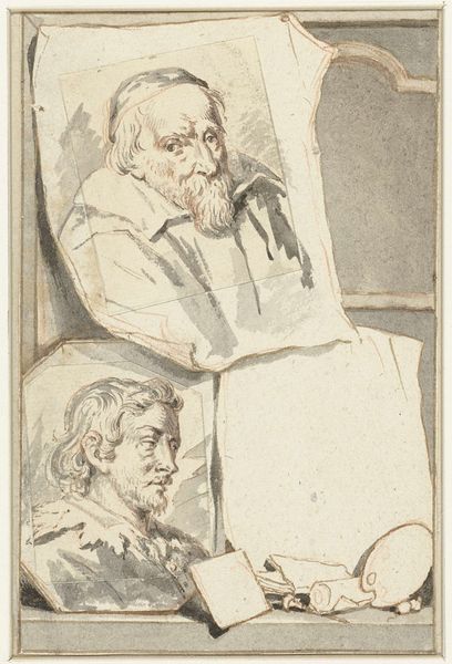 Editor: Here we have an engraving from 1764, titled *Portretten van Quinten Massijs I, Jheronimus Bosch en Aertgen van Leyden*, created by Jan l' Admiral. The composition feels like a playful take on the artist's studio, with these almost comically serious portraits. What jumps out to you? Curator: Oh, this! This feels like stumbling upon a delightful secret, doesn't it? It’s more than just portraits; it's a hall of mirrors reflecting on artistic legacy. Admiral's choice to depict Massijs, Bosch, and van Leyden together, well, it's like gathering mischievous spirits for a séance. Look at how he uses the print medium, the delicate lines suggesting both precision and the slight remove of history. It begs the question: Are these true likenesses or Admiral's fantasies of these masters? Editor: That's fascinating, the idea of it being a fantasy! I hadn’t considered that. I was focused on how serious they all look, but the thought that it might be imagined makes me wonder what he thought about each of them. Curator: Precisely! Think about Bosch's inclusion – known for his surreal landscapes and moralistic themes. Placing him alongside more "traditional" portraitists like Massijs... is it commentary? Admiration? Perhaps even a little artistic envy? He’s basically creating his own artistic pantheon here. What I love is how it invites us to play art historian, piecing together narratives. Editor: It's definitely made me rethink what a portrait can be! More than just a record, but an interpretation. Curator: Exactly! It's less about visual accuracy and more about the artist's dialogue with the past. That’s the magic, isn't it? We began by looking and have somehow tumbled headfirst into the artist's mind and art history at once. A wonderful entanglement, really.
