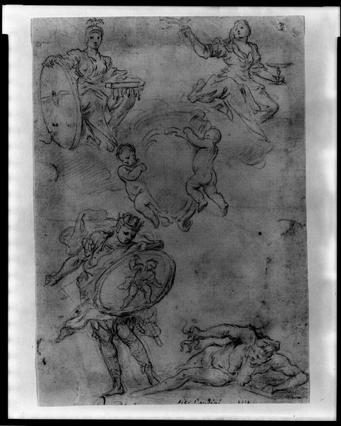 Curator: Alright, let's delve into this intriguing sketch. This pencil drawing, titled "Study for the same," comes to us from sometime between 1710 and 1780 and the hand of Francesco La Marra. It currently resides at the SMK, the Statens Museum for Kunst. Editor: Woah, this looks like the visual equivalent of a half-remembered dream. Like when you wake up, and the details are already slipping away! There’s this ethereal, floating quality about it. It looks…fragile, you know? Curator: Fragility is a keen observation. The lightness of touch, the almost ghostly rendering, does lend itself to that interpretation. I think we can also view that ephemerality through the lens of its status as a study, a preliminary investigation. What is La Marra attempting to capture here? And perhaps more importantly, who is the "same" referenced in the title, and how are the identity politics playing out? Editor: Good point, who IS the "same?" Maybe a more innocent reading – and here's where I probably romanticize it a bit too much! – it almost has this weightless feeling about it, almost a pre-Raphaelite sense of capturing pure, idealized, dare I say, beauty. Curator: The baroque stylistic elements certainly encourage a reach toward idealized forms, although in the 18th century it became somewhat more stylized, emphasizing spectacle and sometimes concealing power structures, specifically around representation. It might even be useful to apply feminist theories here, exploring the objectification inherent in capturing female figures. How do societal expectations influence the rendering? Editor: Oh definitely! Now, you've yanked me back to earth. Okay, it makes me consider if it captures a "truth," a moment, or what the expectations were around capturing "feminine virtue." What is more "important?" Is it the artistic talent and "virtuosity" of the image making, or that this is not actually trying to make a picture of an individual with feelings. Which honestly makes it less of a weightless reverie. And more ghostly, even morbid in a sense. Yikes! Curator: Exactly. It allows a glimpse into a time when depictions, especially of women, served very specific, ideologically charged purposes. It moves the discussion beyond mere artistic appreciation, placing it within social critique and intersectional feminist analysis. Editor: You know, when I first glanced at it, I was ready to wax poetic about ethereal beauty and artistic genius. But seeing it with a more critical lens…wow, it just hits differently. Curator: That interplay, that tension, is where the value lies. Art doesn't exist in a vacuum. Editor: Absolutely! Makes you wonder what else this “sketch” holds!