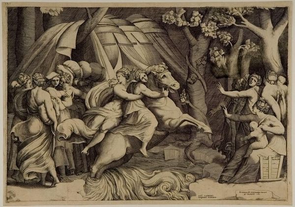 Editor: We're looking at "Cloelia on Horseback Crossing the Tiber," an engraving made sometime between 1535 and 1545 by Giulio Bonasone. What strikes me first is the incredible movement, almost chaotic. The horse seems to leap right off the page! How do you interpret this work? Curator: Ah, yes, chaotic indeed! Like a vivid dream clinging to the edges of waking. To me, it feels like Bonasone has captured a moment of pure Roman bravado. He's not just showing us a historical event; he's breathing life into legend. Cloelia leading her fellow hostages to freedom, choosing daring over despair… don't you find that resonates even now? What does the landscape itself evoke for you? Editor: I hadn't thought of the landscape. It looks wild and untamed, a bit scary. Is it supposed to mirror the danger of their escape? Curator: Exactly! See how the trees claw at the sky, how the water churns? Bonasone’s really playing with our senses here, doesn't he? But look closer still. The details— the almost fussy attention to the horse's musculature and the folds in their garments—those whisper of a celebration of beauty, even in the midst of chaos. It’s as though he’s saying, “Yes, life is perilous, but isn’t it glorious?” Editor: So it’s not just about the history, but also the artistry, about finding beauty even in a dramatic scene? Curator: Precisely. He asks us to pause, to witness, and perhaps, just perhaps, to find the Cloelia within ourselves. Or perhaps not. That’s the beautiful cruelty of art; it holds the mirror up and asks *you*, finally, to see. Editor: I love the idea of looking for "the Cloelia within." Thanks for sharing your perspective. Curator: And thank you for asking such insightful questions. It’s these conversations that keep these old stories alive, isn't it? Like a relay race through the ages!