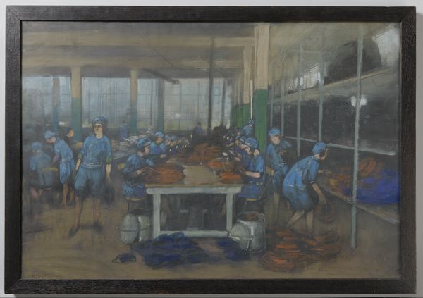 Here's a view inside 'De glasfabriek te Leerdam: het machinaal persen van glas,' a painting by Herman Heijenbrock. Heijenbrock was deeply affected by the impact of industrialization on Dutch society, particularly on the working class. This artwork captures a scene of labor, showing men working with molten glass in a factory. What strikes me is how Heijenbrock captures both the intensity and the monotony of their work. The subdued tones and the repetition of figures create a sense of the relentless rhythm of industrial production. Notice the figures in the background, their faces blurred, almost erased by the smoke and heat. There's an emotional weight to the scene, a sense of the physical and psychological toll of this labor. Through art, Heijenbrock draws attention to the human cost of industrial progress. It's a portrait of a specific time and place, but it also speaks to the broader issues of labor, class, and the changing nature of work.