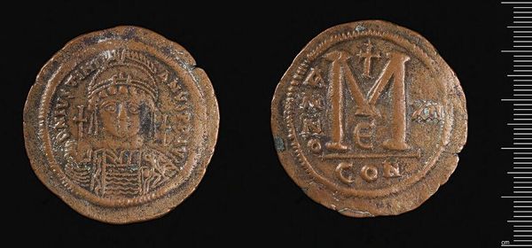 Curator: This object is a coin from the reign of Justinian I, a significant figure in Byzantine history whose rule shaped the political and religious landscape of the era. Editor: It feels so weighty, literally and figuratively. Look at the formality of the portrait, it's stiff, imposing. The coin itself is quite worn, but still evokes a sense of lasting power. Curator: Precisely. This coin functioned as both currency and propaganda, circulating the emperor’s image and solidifying his authority across the empire. Note the deliberate iconography designed to project divine sanction and imperial might. Editor: The depiction of Justinian holding a cross, surrounded by inscriptions... these weren't just images, they were potent symbols for the largely illiterate population, conveying a message of strength and righteousness. Curator: And control. Coinage was essential for taxation and trade, providing Justinian the means to fund his ambitious building projects and military campaigns, reshaping the empire's infrastructure and legal code. Editor: Seeing the visual language of power so directly, gives a unique insight into the mind of the ruler and the relationship with the ruled at that time. Curator: Indeed. This coin serves as a small but powerful artifact, revealing the intersection of economics, politics, and imperial ambition in the Byzantine world.