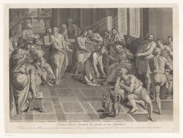 Jean Pesne created this engraving, entitled "Death of Sapphira", in France in the 17th century. It captures a moment of divine retribution within a classical architectural setting, reflecting the era's fascination with both religious narratives and classical antiquity. Pesne's image visually conveys the power of religious authority through the figure of Saint Peter, who condemns Sapphira for her deceit. The dramatic composition and the emotional responses of the surrounding figures underscore the moral lesson. This print can be situated within a broader cultural context of religious art used to instruct and reinforce social norms. To understand Pesne's work fully, we might investigate the prints and engravings market in 17th-century France, the social function of religious imagery, and the role of institutions like the church in shaping artistic production and consumption. Through this we can appreciate how art is embedded in, and reflective of, its social and institutional contexts.