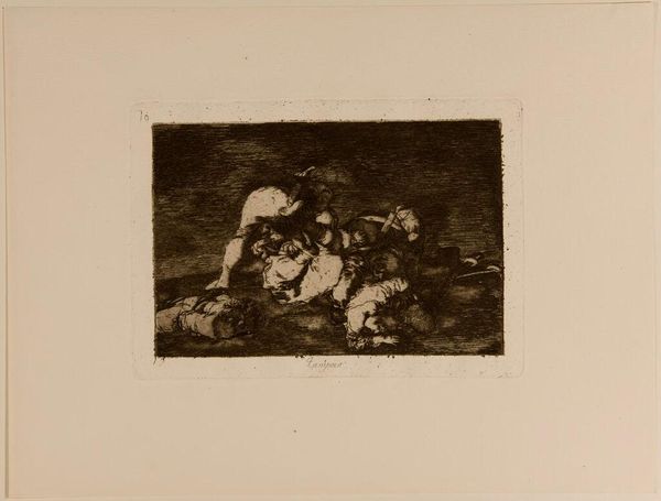 Editor: This is "He Gets Something Out of It" by Francisco Goya. It looks like an etching, and I'm struck by the stark contrast between light and shadow. What can you tell me about it? Curator: Well, if we consider Goya's likely use of aquatint, we see how his manipulation of the plate's surface allowed him to achieve these tones. But, importantly, what "does he get out of it?" Consider the labor and materials involved in both the depicted act and Goya's artistic process. How might those connect? Editor: So, the suffering in the image might relate to the artist's labor? Curator: Precisely! The printmaking itself is a kind of exploitation, reproducing the scene for wider consumption. It makes you think about the whole system of production and reception, doesn’t it? Editor: It really does! I hadn't considered the social implications of the printmaking process itself.