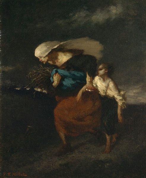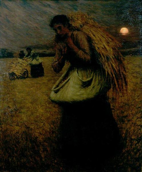 Jean-François Millet painted this small oil on canvas, "Norman Milkmaid," sometime in the mid-19th century. The painting's visual impact arises from its subtle rendering of light and shadow. The warm, muted palette creates a gentle, melancholic atmosphere. Millet's careful arrangement of forms guides our eyes. The milkmaid stands as a solid, central mass, balanced by the luminous orb of the moon behind her. This juxtaposition creates a visual tension, drawing us into the scene. We can interpret Millet's artistic choice as a reflection of broader societal tensions. As the French countryside underwent modernization, the art world engaged with new ways of thinking about labour, class and the rapidly changing social landscape. This painting reflects the values of rural life during great social change. Consider the milkmaid's placement and the direction of her gaze. Millet invites us to question fixed social roles and to contemplate the human condition beyond the mere depiction of rural life. "Norman Milkmaid" is a reminder that art can challenge our understanding of the world.
