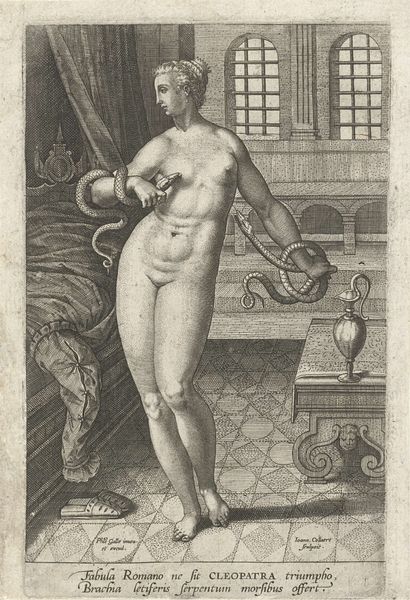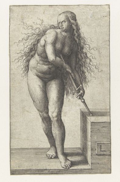 This is Lucas van Leyden’s "Lucretia", a small but powerfully rendered engraving. The composition centers on the figure of Lucretia, poised in a moment of tragic resolve. The artist’s skilled use of line and hatching creates a rich surface, emphasizing the musculature of her form and the flowing cascade of her hair. The visual structure here plays with contrasts. The soft, organic lines of Lucretia’s body and hair are juxtaposed against the sharp, geometric forms of the pedestal and the cold, hard lines of the sword. This contrast serves to highlight the tension between her physical presence and the impending act of self-destruction. The engraving functions as more than a narrative illustration. Through the deliberate arrangement of lines and forms, Leyden encourages us to consider the broader themes of sacrifice, virtue, and the complex interplay between the body and the will. The piece serves as a powerful meditation on the structures of morality and representation.