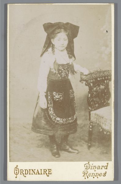 Curator: Here we have an intriguing studio photograph titled "Portret van een onbekende Groningse student in maskeradekostuum," dating from around 1896 to 1900. The photographer was Jan Frederik Blöte. Editor: It has such a whimsical feel to it, yet simultaneously a staged and studied quality. It’s like a theatre student thoroughly enjoying dressing up, almost giddy. Curator: Exactly! The photograph captures a specific cultural moment. Masked balls and student societies were quite prevalent in Groningen at that time. The act of masquerading allowed individuals to temporarily escape societal norms, a performative rebellion, in a sense. Editor: Right. But what strikes me most is the quality of the clothing. The texture of the velvet and the meticulous construction are clearly shown here. This wasn't just any off-the-rack costume; someone put effort into crafting it, or having it crafted. The satin ribbon decorations on the shoes and the ornate details of the sword also imply wealth. Curator: The choice of photography itself speaks volumes. It provided a medium through which students could immortalize their participation in these events. But studio portraiture was also developing in that period, solidifying photography’s place in constructing self-image. The photographer here identifies himself as “Photograaf en Retoucheur,” reflecting the early manipulation practices used at the time. Editor: True! The surface itself, that sepia tone, it is what connects it to a specific period and technique. But also, the backdrop. It seems rather carelessly painted with simple brushstrokes that are not meant to resemble nature realistically. That contrast between that slightly clumsy staging, the quality of the costume and the focused portrayal of the character are remarkable to me. Curator: Well put. The contrast reveals both the manufactured nature of the spectacle and the very real social significance such events and their photographic records held. It highlights how young men, in their construction of public roles, also construct a shared history within student societies. Editor: Absolutely, a carefully crafted and preserved cultural artifact where both individual and community come together, through material means, into a beautiful, almost antiquated record. Curator: I agree. The picture provides a glimpse into a world where clothing, social engagement and photographic media interplayed to mold social identities and contribute to group history.