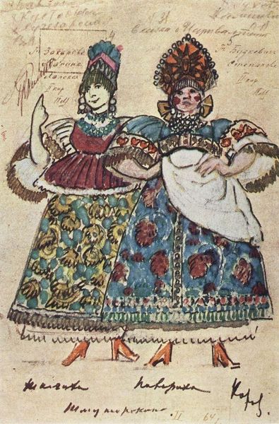 Léon Bakst made this fashion plate, Fantasy on Modern Costume, using watercolor and graphite. The rendering is so simple, like he’s just marking the paper. It's all about shapes and colors. Like he starts with the idea, not the specifics, and then paints his way in. Look at the red dress, it’s covered with these teardrop shapes, like seeds fallen on the surface. The colors are flat, almost like they are cut from paper and pasted down, but the graphite line work gives definition. It makes me think of Matisse. It’s as though the image is a stage set itself. Bakst designed sets and costumes for the Ballets Russes. His work shares something with Sonia Delaunay’s textile and costume designs, and recalls Picasso’s for the Ballet Russe, Parade. This is where art forms merge, exchange ideas, and converse with one another. We get to listen in.