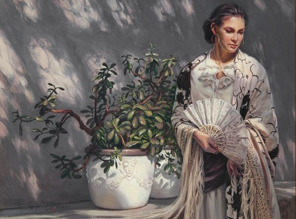 Curator: The work we’re looking at is called "Morning Roses," an oil painting by Adrian Gottlieb. The piece shows a young woman gently holding and smelling a rose. It feels like a very classical, romantic image. What catches your eye? Editor: The texture is interesting. The softness of her skin seems to contrast with the heavier texture of the surrounding foliage and her clothing. And the dress isn't a historical piece, and that pulls my eye. What can you tell me about how its materials might relate to the rest of the composition? Curator: Note how the artist uses oil paint to achieve such realism. What is oil paint composed of? Ground pigments, often mined or synthesized, bound in a drying oil. Now, consider the implications of using such labor-intensive materials, and how they connect to the depiction of beauty and leisure in the image itself. What societal values are embedded within that act of creation, using the techniques that he has? Editor: That’s a good point. The detail achieved is incredible. I guess I hadn't thought about where oil paints came from, the historical processes necessary to produce them. Does Gottlieb’s realism then become a statement itself? Does the conscious act of portraying in minute detail lend some symbolic weight to the act? Curator: Exactly. And, going back to your comment about the fabric of her dress...what’s suggested when he pairs painstaking realistic method, with what seems to be, some printed modern textile? Editor: I suppose, in one sense, the ready availability of modern clothing contrasts to the handmade nature of the oil paints. Almost juxtaposing modern industrial practices with more traditional labor-focused modes of artistic creation. It speaks to availability and labor. Curator: Precisely! Reflecting on these things really makes you consider the broader cultural context woven into the artwork, doesn't it? Editor: Definitely! I’ll never look at the material components of art the same way again!
