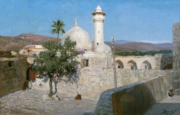 Edwin Lord Weeks captured this scene of figures in the courtyard of a mosque on canvas, a tranquil tableau punctuated by symbols of Islamic faith and life. Domes and minarets, iconic in Islamic architecture, rise prominently, representing spiritual ascent and the connection between the earthly and divine. The ablution fountain, where men perform ritual cleansing, echoes the ancient Greek practice of purification before entering sacred spaces. The act of cleansing has resurfaced, evolving from pagan rites to a central practice across various faiths. Consider the seated figures reading. In ancient Egyptian art, seated scribes were symbols of knowledge, which later appeared in classical Greek depictions of philosophers. The human quest for knowledge and understanding is a cyclical journey, resurfacing throughout history. The image stirs a deep, subconscious recognition of humanity’s shared spiritual and intellectual heritage, engaging viewers on a profound level.