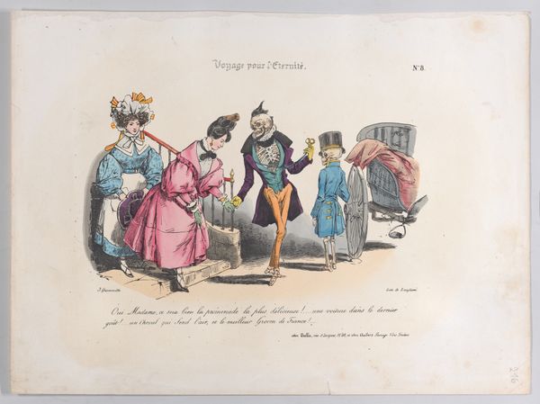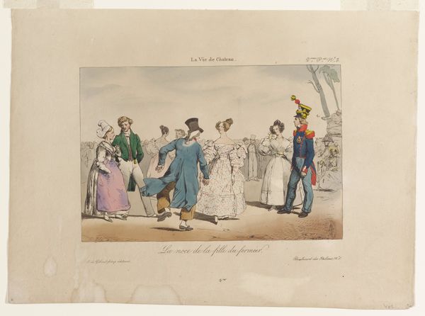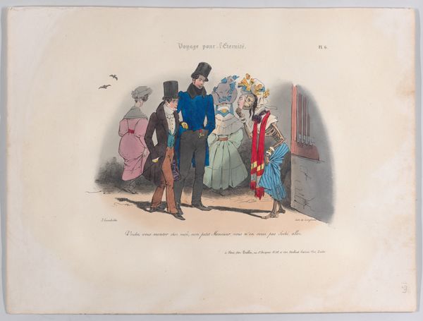 Editor: This print, "Caricature. No. 4. 2eme Partie. Les anglais du voisinage." by Eugène-Louis Lami, created in 1833, strikes me as a very staged and somewhat satirical scene. The way the figures are arranged and the expressions on their faces give the sense of a carefully constructed performance. What’s your take on it? Curator: It is interesting to see it through the lens of performance. I think you’re onto something regarding the theatrical quality. But have you considered the historical context of Anglo-French relations in the 1830s? Editor: I haven't really. Tell me more. Curator: Well, this was a period of relative peace, but also ongoing rivalry and mutual stereotyping between the two nations. This print, whose title translates to "The English of the Neighbourhood," appears to depict an encounter between French and English families. Is it intended to critique the perceived stuffiness or formality of the English? Editor: I see. It’s like Lami is holding up a mirror to cultural differences and maybe exaggerating them for comedic effect. The very formal greeting seems at odds with the implied intimacy of neighbors. It brings attention to cultural biases embedded within seemingly innocent social interactions. Curator: Precisely. Consider how such images circulated and shaped public opinion. Lami's print participated in constructing, and perhaps reinforcing, national identities and stereotypes through visual representation. It's fascinating to think about its role in shaping perceptions and solidifying "us versus them" mentalities. Editor: That's a perspective I hadn't considered fully. So, beyond just being a funny image, it’s engaging in a wider political and cultural discourse. Thanks! Curator: My pleasure! Examining art as a product and shaper of cultural narratives always reveals so much.