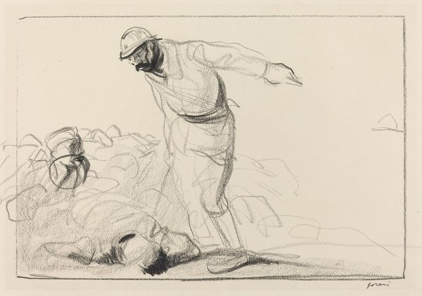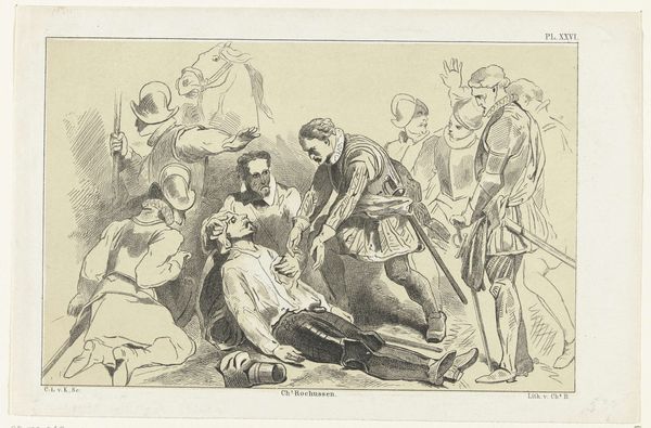 Editor: So this etching, "It Is Amazing-And We Were Made by God [Furious Folly]," by Francisco Goya, dates from around 1813 to 1820. The whole scene feels… chaotic, even a little desperate, and that title, juxtaposed with the grim imagery, it's unsettling. What do you see when you look at this piece? Curator: Unsettling is a perfect word, because it seems Goya delights in plucking at our heartstrings, then knotting them up something fierce. Those huddled figures, their faces obscured… it’s as though he’s presenting humanity stripped bare, during times that tested even the staunchest of souls. Remember, Spain was enduring immense suffering, famine, and political turmoil during these years. This etching… it's not just a scene; it's a scream. Editor: A scream, yes! That’s a powerful way to put it. What about the figure with the staff? He seems almost confrontational. Curator: He is, isn't he? Charging forward, eyes blazing with… well, what do you think he's blazing with? Rage? Desperation? Perhaps a desperate defiance? Goya wasn't one for offering easy answers, you see. The darkness enveloping the composition pushes the drama forward – notice how the artist leaves just a few points of light so we notice the drama even more. Editor: That makes a lot of sense. I was so focused on the immediate figures, I didn’t consider the historical backdrop enough. Now that you point it out, there’s a layered complexity I hadn’t quite grasped. It’s not just observation, but this raw, emotional interpretation. Curator: Exactly! That’s where the true brilliance of Goya shines. It makes you think, doesn't it? It is more than just art to be consumed – you have to sit with this and ponder! Editor: It certainly does. I'm definitely going to spend more time looking at Goya’s work from this period. Thanks!