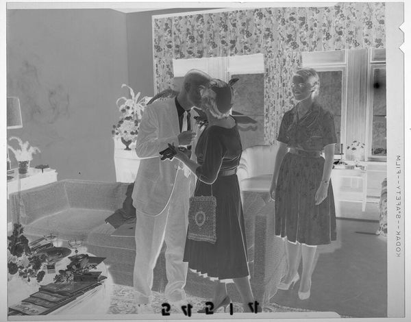 Editor: Here we have an untitled photograph by Martin Schweig, showing a man holding a baby in front of a mirror. The floral couch grounds the domestic scene. What can you tell me about the materials and their significance? Curator: Well, the materiality of photography itself is key. The silver gelatin print, a mass-producible format, democratized portraiture. Consider also the labor involved – from Schweig to the darkroom technician – and how that contrasts with the intimacy of the captured moment. Editor: So, the image is more than just the subject, but also about the process and its place in society? Curator: Precisely. The photographic process, from creation to consumption, reflects broader social and economic forces shaping our understanding of family and self-representation. Editor: That’s a fascinating perspective, I hadn’t considered the production aspect so deeply. Curator: Indeed, analyzing art through its materials can reveal so much about its cultural significance.