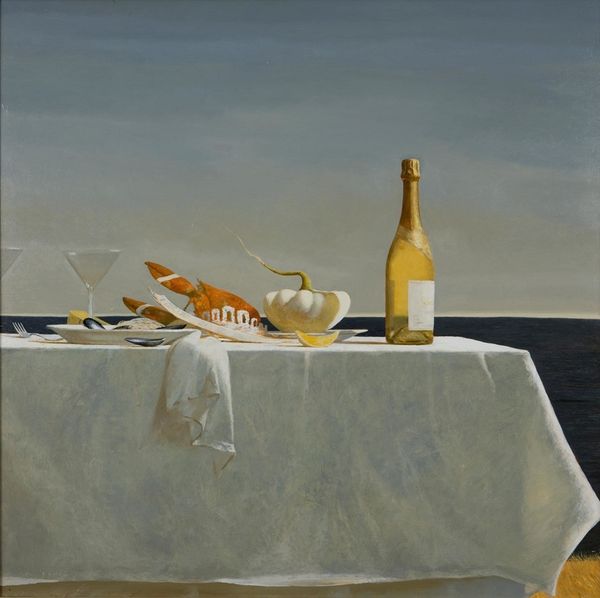 Curator: This artwork, an oil painting, is entitled "Still Life with Grape Juice and Sandwiches (Xenia)" created in 1994 by David Ligare. Editor: My first thought is… serene, almost hauntingly so. The colours are muted and that sliver of sunset in the background… there’s something incredibly still about it all. It’s both comforting and isolating. Curator: Comforting, perhaps in its apparent simplicity? It features just that – grape juice, sandwiches, but I encourage that we not accept it at face value. Consider Ligare's broader explorations. He often revisits classical themes through a contemporary lens, challenging traditional power dynamics within established structures. Editor: And how do you see those challenges manifesting here? Is there a societal or historical power play evident through juice and sandwiches? I’m not quite seeing it. Curator: Look at the sharp geometry contrasting with the still life. This painting complicates traditional ideas of domesticity. The inclusion of everyday objects challenges expectations around gender and labor roles in the domestic sphere, placing them against the open, possibly boundless ocean. It suggests the complexities that arise when the private interacts with the public. It highlights an attempt to reimagine everyday experiences. Editor: Interesting. I saw that seascape as purely aesthetic, a contrast to the constructed interior space. So you see something overtly political? Curator: Not overtly, but suggestively so. It hints at the unspoken power dynamics shaping seemingly ordinary moments. Consider the implications of representation, particularly within still life, historically a space for the display of wealth or cultivated taste. Ligare complicates this by focusing on a modest meal in an unsettling context. Editor: Okay, I grant you that. It's not your typical opulent display, and there is that odd light cutting across everything, making it look more like a stage set than a lived-in space. Curator: Precisely. And how the shadows stretch… suggesting perhaps unspoken truths? Or maybe challenging viewers to examine the unexamined aspects of our world, those power dynamics ingrained in daily routines. Editor: It certainly lingers in the mind, offering a new lens through which to consider an ordinary moment in the context of broader social narratives. Thank you for illuminating that, truly. Curator: It only requires openness to challenging one’s perceptions. My pleasure entirely.