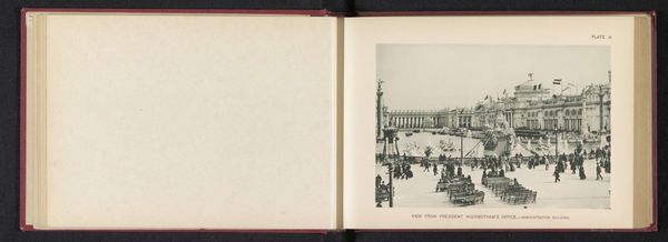 Editor: This is a photographic print from 1893 by Charles Dudley Arnold, showcasing the Agricultural Building at the World's Columbian Exposition in Chicago. The boat in the foreground gives the whole scene a stately, almost cinematic feel. What do you see when you look at this image? Curator: Immediately, I think about the materiality of the "White City." The grand neoclassical architecture wasn't built to last; it was primarily plaster and staff, a mix of plaster of Paris, cement, and jute fibers. Consider the labor involved: armies of workers, many recent immigrants, hastily constructing this vision of American progress. This albumen print, fixed onto paper, becomes a record of that immense, ephemeral undertaking, its consumption, and its afterimage. Editor: So, it’s less about the building itself and more about what it represents and how it came to be? Curator: Exactly. Look at the image's starkness, the almost brutal clarity of the print. This isn’t just documenting architecture, it's documenting a particular moment of industrial capacity and social ambition, manifested through material and labor. It prompts us to consider the exposition’s influence and the workers' stories omitted from those official narratives. Editor: I never thought about it that way – the physical materials as telling a story, a story beyond just the image. So much hidden labor! Curator: And consider photography’s own industrialization. The mass production of images allowed for wide dissemination of this constructed image, fueling the narrative of American exceptionalism. How does viewing the architectural vision shift by knowing it was built on cheap materials? Does that amplify or cheapen it? Editor: That really makes you rethink the intentions and the reality behind these seemingly grand structures. Thanks for sharing that perspective!