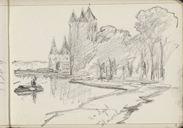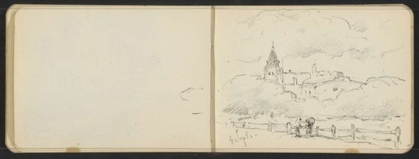 Editor: We're looking at Willem Cornelis Rip's "Gebouw met een toren" or "Building with a tower" from 1920, created with, it looks like, pen and ink. It's quite a delicate sketch, but I find it almost haunting. What visual elements stand out to you the most? Curator: Immediately, the contrast between the sharp, deliberate lines defining the tower and the more ambiguous, almost atmospheric rendering of the surrounding structures draws my attention. Consider how the artist employs line weight and density to create spatial depth and visual interest. Are the blurred shapes just scaffolding? A different stylistic rendering? How do they impact our perception of the primary subject, the building itself? Editor: I see what you mean about the line work, it does set the tower apart. So the contrast sort of creates a visual hierarchy? Curator: Precisely. This visual stratification isn’t arbitrary. Notice the meticulous detail invested in the tower's architecture compared to the generalized forms surrounding it. This strategic imbalance encourages viewers to prioritize the tower, prompting inquiries into its function, significance, or even symbolic value within the broader composition. Consider too the use of tonal values to indicate light and shadow. Where does the artist place the highlights, and what effect does that have on our perception of form? Editor: That's a fascinating way to approach it. So, rather than searching for outside meaning, we should be analyzing what the artist does on the page and what it means for the artwork itself. Curator: Precisely! The formal elements provide the most direct route to meaning. We do not necessarily need to look to the outside for the work to speak. What do we both see now that we did not notice before? Editor: I agree, looking closer at how line and contrast is used it directs the eyes and gives clues to where to derive meaning from the artwork. Thanks, that was interesting.