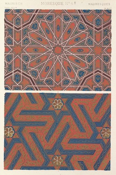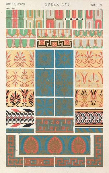Editor: We’re looking at Owen Jones’ "Arabian No. 5", a drawing from 1856. It's really striking how Jones combines all these different geometric and floral patterns on one page. I almost feel like I'm peering through a kaleidoscope. What's your interpretation of this dazzling array? Curator: Ah, "Arabian No. 5," yes. Jones had a passion for bringing global decorative traditions to the Victorian era. Imagine him, almost dizzyingly inspired, sifting through visual information to give us *this.* Each motif here, a little visual poem, tells a story from Islamic art. And that rosy palette! It's both comforting and captivating, isn’t it? Editor: Definitely captivating! It's almost overwhelming to take it all in, though. Do you think he’s making a specific point by showcasing so many diverse patterns together? Curator: Perhaps he's showing the underlying unity within seemingly disparate traditions. It's like he’s saying, "Look, beneath the surface, we all share a love of order and beauty." It's a noble pursuit, really – creating harmony from visual abundance. Makes me wonder what patterns Jones saw in his own life... and what sort of designs you'd dream up. Editor: I suppose I find it hopeful - his intent to celebrate many styles, but I'm drawn to clean minimalism. I'd choose emptiness instead! Curator: But is emptiness not, in itself, a pattern of its own sort? *That’s* something to sleep on. Thanks for making me dust off the creative corners of my mind, that really took a whirl! Editor: Likewise! It's helpful to hear your creative thinking. I appreciate the reminder to go beyond surface impressions, and to think deeper.