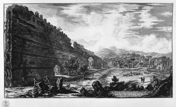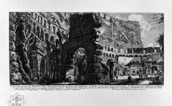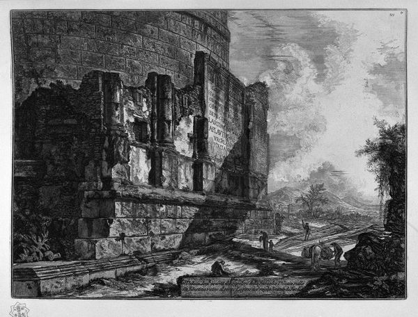 Editor: Here we have Piranesi's etching, "Following the above table, with a special section." The decaying architecture and the almost ghostly figures give it such a dramatic, haunting feel. What strikes you most about it? Curator: Haunting is the perfect word! I’m drawn to how Piranesi juxtaposes the grandeur of the classical past with its crumbling present. Imagine him standing there, sketching this very scene…he wasn’t just recording what he saw. He was dreaming! He shows how even the most imposing structures succumb to time, to nature's persistent reclamation. Do you see the way he uses light and shadow? Editor: Yes, it’s so stark. The shadows really emphasize the broken edges and the overgrowth. It feels romantic and melancholy at the same time. Curator: Precisely. The artist wasn't just documenting ruins; he was contemplating the nature of mortality, of civilizations rising and falling. It’s a bit theatrical, wouldn’t you say? All those figures posed as if on a stage? Editor: I do see that. Almost like actors amidst the ruins. I guess it does add to the drama. Curator: It's like he's asking: "What will remain of our own grand designs?" The figures underscore the ephemeral nature of human achievement, which perhaps lends a universal and timeless message to the work. The mountains in the distance almost whisper the tale. What does it all whisper to you now? Editor: I see now that the ruin isn't just about physical decay, it's a meditation on history and our place in it. And I see what you mean about that inherent, almost theatrical melancholy. Thanks, I hadn’t quite thought of it that way.