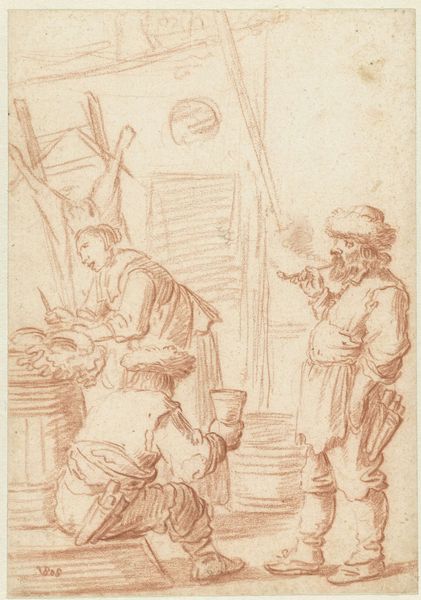 Curator: Here we have "The Roman Centurion Cornelius Sending his Men to Joppa," a drawing attributed to Willem Drost, created around 1653. It’s rendered in ink on paper. Editor: It’s all very… brown. The artist clearly prioritizes capturing dynamic posture and composition with fluid strokes, though, which lends it immediacy despite the restricted palette. Curator: Exactly. And the choice of medium, ink on paper, speaks volumes about its likely purpose – perhaps a preparatory sketch or a study. The fast, economical lines allowed Drost to quickly visualize and refine his ideas, reflecting a work-in-progress stage focused on efficiency. Editor: Agreed. I'm captivated by how the simple lines construct weight and shadow. Note the density of the hatching under the table and how it gives form to the drapery. Even though the background fades, the architectural details hint at depth without committing to precise detail. Curator: And consider the social and economic conditions underpinning the creation of such drawings. Paper production, the accessibility of ink – these determined who could participate in image making. Patronage also shaped these narratives from the bible, reflecting societal values. Editor: Undoubtedly. The cultural values emerge, certainly, in the somewhat ambiguous figuration. Look at Cornelius, in his turban, as opposed to the western garbed figures. Drost appears to emphasize a clash of civilizations and possibly trade relations. Curator: The figures' clothing provides insight into costume practices of the era, and perhaps more immediately highlights wealth. Labor shapes their presentation—note that the quality of the textiles they’re wearing surely comes from many artisans’ hands. Editor: It’s remarkable how much expressive depth he manages. While his linework is undoubtedly baroque, the ink conveys mood without superfluous drama or color—just line and tonal relationships in their purest form, which almost anticipates abstraction. Curator: Drost’s method gives us insight into studio practice as well. Considering materiality directs our focus away from the subject matter and invites consideration about the working process and the resources needed to communicate biblical scenes to seventeenth-century audiences. Editor: Precisely. It makes me reconsider the role that texture plays and allows us to read past narrative. Thank you for drawing my attention back to Drost’s material reality. Curator: A final point of contemplation for our listeners—art is inherently contextual. As consumers, we actively interpret and derive meaning influenced by available information. I am glad to have reevaluated with you the role material has on interpreting art's message.