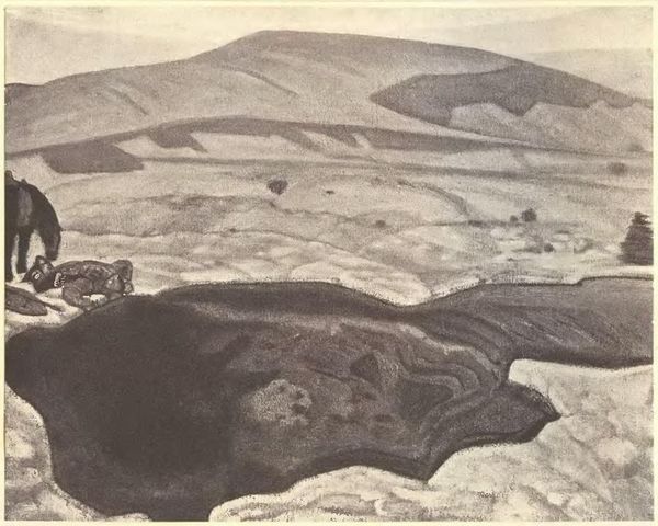 Editor: So, this is M.C. Escher’s "Lava Flow from Etna," created in 1933. It’s a black and white print, and my first thought is how stark it is. What strikes you about this piece? Curator: What grabs my attention is not simply the depicted scene but the political ecology implied in this stark rendering. Escher's intense contrast mirrors the raw power of nature reshaping landscapes but also reminds me how human communities exist within—and are impacted by—geological forces. How might the residents nearby perceive the mountain: is it simply a source of agricultural wealth, or also a threat? Editor: That's a good question. I was mainly thinking about the formal composition, but I guess I wasn’t considering how that landscape affects lived experience for people. Curator: Exactly. In what ways does Escher make nature itself the protagonist? How is the environment not a simple, inert background to daily life? How does Escher capture a time of change, in between an eruption that previously transformed the land, but also right before another could drastically re-arrange its communities? Editor: I see your point. The mountain and the fields are the central focus. It’s not a peaceful, static landscape painting. There’s tension here, a sense of underlying dynamism and possibly threat, so perhaps he makes that tangible. Curator: Right. We have to ask who benefits, and who suffers when the earth's crust convulses like this, altering patterns of habitability and cultivatable land. By viewing the landscape this way, it's almost impossible to remove power relations in society. It seems to urge us to rethink our relationship with a world that can—and perhaps inevitably will—remake itself. Editor: I hadn’t thought about it that way at all. Looking closer and thinking about the environmental impact, it does change how I see this work and Escher’s possible intentions in depicting such raw tension. Thanks!