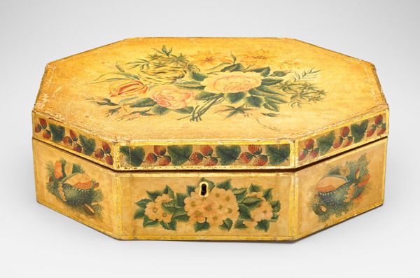 Editor: Here we have a hat box from around 1919, made with cardboard and paper that is printed with these charming, almost naive flowers. It strikes me as incredibly personal, like something a woman might have made for herself to brighten an everyday object. What can you tell me about this hat box, particularly from the vantage of gender and domesticity? Curator: It's perceptive of you to read this hat box as intimate and connected to a feminine sphere. Objects like this, though often dismissed as mere 'decorative art', actually provide fascinating insight into women's lives and creative expression during the early 20th century. Think about it: who had access to creating 'high art' and whose stories are told through these kinds of 'crafts'? This was produced during a period of great societal upheaval, just after World War One and as women were fighting for suffrage in many countries. Do you think there might be a relationship between these wider cultural shifts and a movement to make statements through more accessible materials? Editor: That’s a really interesting point about the democratization of artmaking. Maybe something like this offered a space for creativity outside the traditional art world, especially for women? I am curious about this interplay between utility, decoration, and possibly female agency. Curator: Exactly. Consider also the use of floral motifs. How might we read these pumpkin-shaped roses not just as decorative elements but also as coded messages relating to womanhood and the natural world? Does this imagery challenge or reinforce prevailing societal expectations of women during this time? Editor: I never would have thought to analyze a hat box in that way. Thanks for expanding my understanding of how everyday objects can embody larger cultural and political themes! Curator: My pleasure! By viewing art in this way we uncover many silent voices.