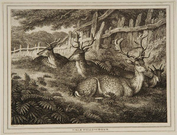 Curator: This is Samuel Howitt's "Male Red Deer." Howitt, born in 1756, was known for his sporting and animal scenes. There's no date associated with the work, but it gives a glimpse into how animals were regarded, both aesthetically and materially. Editor: It’s quite striking. The texture achieved through the printmaking process gives it an almost velvety feel. It emphasizes the physicality of the deer—their muscle, bone, and fur. Curator: Exactly. Howitt's technique allows for a tangible representation of the deer, which speaks to the relationship between humans and animals as resources and subjects of observation. It also reflects the social status associated with hunting. Editor: I see the print as an object, too. The paper, the ink, the skill required for its production—each element tells a story of consumption and value. It’s not just about representing the animal but capturing its essence through accessible means. Curator: And by extension, making that world accessible to a wider audience, bringing the elite sport of hunting to those who could only experience it vicariously. Editor: A way to democratize access to what was usually an exclusive domain through material production. Curator: Precisely. It’s fascinating how closely the artistic process is bound to the social hierarchy it depicts. Editor: Indeed. It underscores the complex interplay of class, culture, and material expression that artworks embody.
