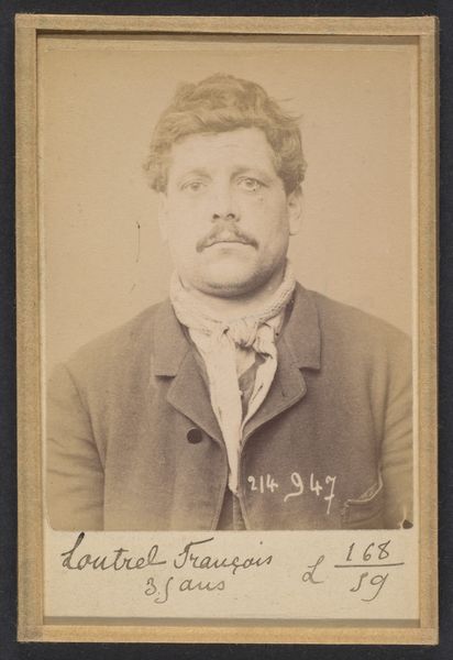Curator: This photograph, taken in 1894, is attributed to Alphonse Bertillon. It's titled, rather directly, "Nic. Celestin. 20 ans, né à Conflans-St-Honorine (Seine & Oise). Emballeur. 26/2/94." It's currently held at the Metropolitan Museum of Art. Editor: The sitter has such a solemn look; he peers right through the lens, unflinching. The sepia tones add to this sense of gravity. And there's this inscription too - it gives a clinical air, yet I can't help but read a human story in his face. Curator: You know, these aren’t just portraits; they're part of Bertillon’s system of criminal identification called "Bertillonage". This photographic technique was paired with precise body measurements and aimed to categorize and track recidivists. He wanted a new form of legal control and data at his fingertips. Editor: So, while ostensibly a factual record, it's absolutely steeped in power dynamics. It positions the subject not as an individual, but as data. A unit to be filed, quantified, and managed. Consider what the context implies about who is behind, and in front of, the camera. A young man being reduced. Curator: Absolutely, but there's a vulnerability in the gaze that transcends the objectifying nature of the process. His clothing is working class with his plain button down and unostentatious blazer, but his stare makes it seem that he's asking a silent, inquisitive question. Does the subject have any agency left? It seems, at the least, like an appeal for empathy. Editor: I'm captivated by the use of photography. At the time, the photographic medium was being increasingly tied to ideas of scientific truth, bolstering the presumed objectivity of the state. But these portraits betray the artifice of those claims. The cracks show when we remember his age, place of birth, and his work are displayed for us to ponder upon. Curator: True, seeing the human details offers another perspective into the picture itself. "Emballeur"—a packer—at 20 years old, just trying to make a life. You find yourself wondering about Celestin. Editor: Ultimately, this photograph raises some profound questions about surveillance, identity, and how systems attempt to contain human complexity. Curator: Absolutely. Art reminds us of that potential tension. The individual versus the system is present, even when the image is over 100 years old.