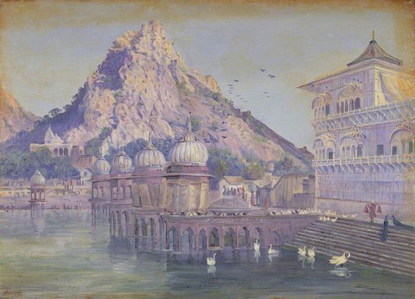 Curator: What strikes me first is the tranquil stillness of this watercolor. It's almost meditative. Editor: I see it too, a deceiving calmness. We are looking at Vasily Vereshchagin’s “Rajnagar. Marble Embankment Decorated with Bas-Reliefs on a Lake in Udaipur,” painted in 1874. Curator: Udaipur! This image is full of familiar architectural features. It speaks strongly to established codes in Indian design, those carved pillars, the formal arrangement. And there is so much repetition, but what do you make of it? Editor: Symbolically, the pillars might represent support and connection to the divine. Visually, the arches frame the view, guiding our eyes to the scene beyond, like portals of access. It presents, really, an "orientalist" fantasy, where Western audiences saw themselves reflected in their colonized territories. Curator: I appreciate your perspective. For me, though, this goes far beyond a mere snapshot in time or "fantasy." Vereshchagin engages here with a space very coded by class and gender, made explicit in the tiny figures along the steps in the lake. What kind of rituals took place there, who were those figures in relation to those rituals and to the space in general? I wonder who and what the artwork excludes. Editor: Those figures are evocative, aren't they? They draw me into an exploration of collective memory. I feel drawn into imagining what rituals occurred by the river, the types of social life along the basin as mirrored by the river. It’s as if that basin served a place for the real, the ritual and even the political to converge, like the basin acts a palimpsest carrying years of human interactions Curator: Exactly. Understanding art within this scope allows us to be aware of what images transmit but also hide. I consider how art becomes an ideological tool in reinforcing power structures, making it key to reveal and reclaim obscured narratives, while engaging contemporary theories about identity and representation to reveal who the image served. Editor: It makes me reconsider what symbols persist. Thank you for sharing a perspective that sheds light to a history that lies hidden beneath symbols. Curator: And thank you, for lending depth to what’s so visibly rendered.