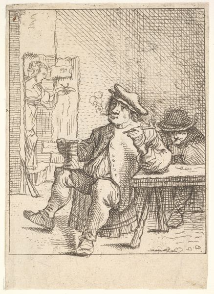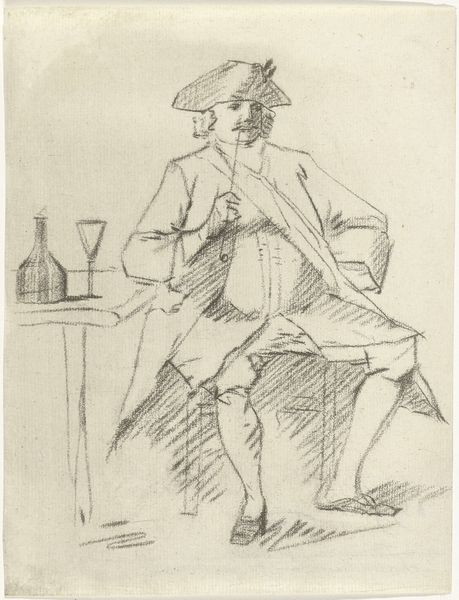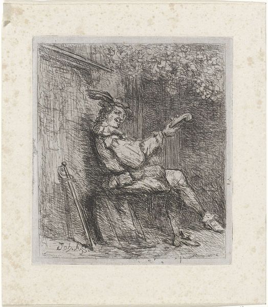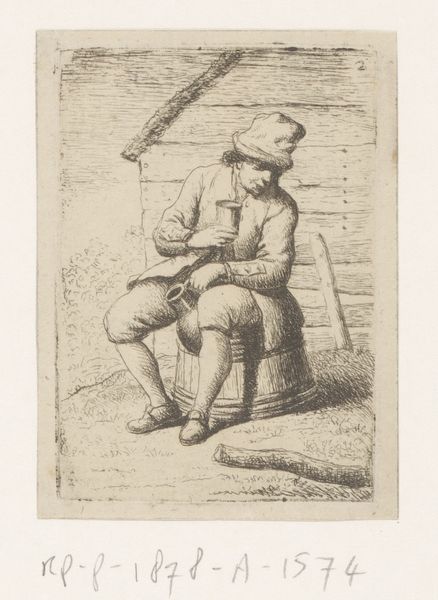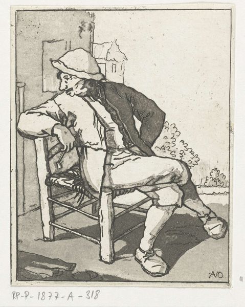 Anthonie van den Bos created this print, *Zittende man*, sometime before 1838. Observe the man’s pose: casually seated with one leg crossed over the other. This seemingly simple posture carries a lineage that stretches far back into history. The crossed-leg pose, often associated with nonchalance or contemplation, echoes in depictions of philosophers and thinkers from antiquity to the Renaissance. Think of ancient statues of seated philosophers, or even images of Christ seated in Majesty. The gesture transcends mere posture; it embodies a state of mind, a moment of reflection or repose. It is a visual motif that resurfaces, evolving in meaning with each iteration, yet retaining a primal connection to our collective understanding of rest and reflection. The simple act of crossing one's legs, therefore, becomes a powerful symbol, engaging viewers on a subconscious level.