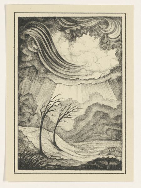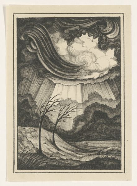 Curator: This engraving, “Eerste scheppingsdag: scheiding tussen licht en duisternis” or "The First Day of Creation: Separation of Light from Darkness", was completed circa 1645-1646. It is currently housed in the Rijksmuseum. Editor: The stark contrast between light and shadow really jumps out, doesn’t it? The figure bathed in light certainly commands attention, radiating both power and… vulnerability, perhaps? Curator: Indeed. Note the engraver's expert use of line. See how varying the density and direction of the lines defines the forms, creates the illusion of depth, and describes the textures of cloud and water. Consider also the balance achieved within the composition—the figure anchoring the top of the composition against the turbulent rendering of the waves beneath. Editor: Right. That dynamic use of line is interesting considering its biblical subject. Early interpretations often frame Genesis as patriarchal and hierarchical, so I immediately wonder what binaries the piece seems to reify. The darkness versus light thematics evoke deeper inquiries concerning creation and power in a 17th-century European context. Curator: We see typical Baroque characteristics: dynamism and an emphasis on creating drama through light, shadow and movement. These are deployed in service of a narrative drawn from a sacred text. One that traditionally presents light as overcoming, banishing the darkness. Editor: Exactly. I’m thinking about how that framework reinforces existing social hierarchies within the colonial period. This construction naturalizes the subordination of the "darker" parts of the world through an artistic language seemingly dedicated to awe and reverence. It makes me consider its role as visual propaganda. Curator: It also functions as a demonstration of technical mastery, doesn’t it? Look at how Sichem has translated such grand ideas into such a small scale. Each element adds to the overall symbolic language the artist communicates, working together to depict an almost overwhelming spectacle of divine creation. Editor: It seems to me we're invited to contemplate not just the genesis of the world but also the genesis of ideologies, and their enduring consequences. Curator: A perfect point to consider. This work, therefore, provides an excellent lens to appreciate artistic prowess while also prompting thoughtful evaluation about the socio-historical frameworks embedded within. Editor: Absolutely. By acknowledging the multifaceted narrative in Sichem’s creation piece, perhaps we glean understanding about our own place within systems of power.